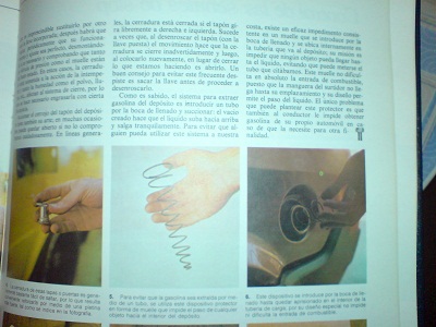 Ahora no puedo sacar el escáner, así que he hecho un par de fotos, creo que se ve bien. A parte de lo que te han dicho, intentar aparcar en otra parte, intentar conseguir un tapón con cerradura (aunque creo que se pueden abrir sin mucho esfuerzo), el método consiste en colocar un muelle como el que aparece en la imágen, la solución es bastante simple y barata, la idea es que ese muelle impida el paso del tubo al depósito de gasolina. Mañana intentaré escanear las páginas, ahora sólo he hecho dos fotos, una con flash y otra sin flash, para ver si podéis verlo. Pinchad sobre las imágenes para verlas más grandes: